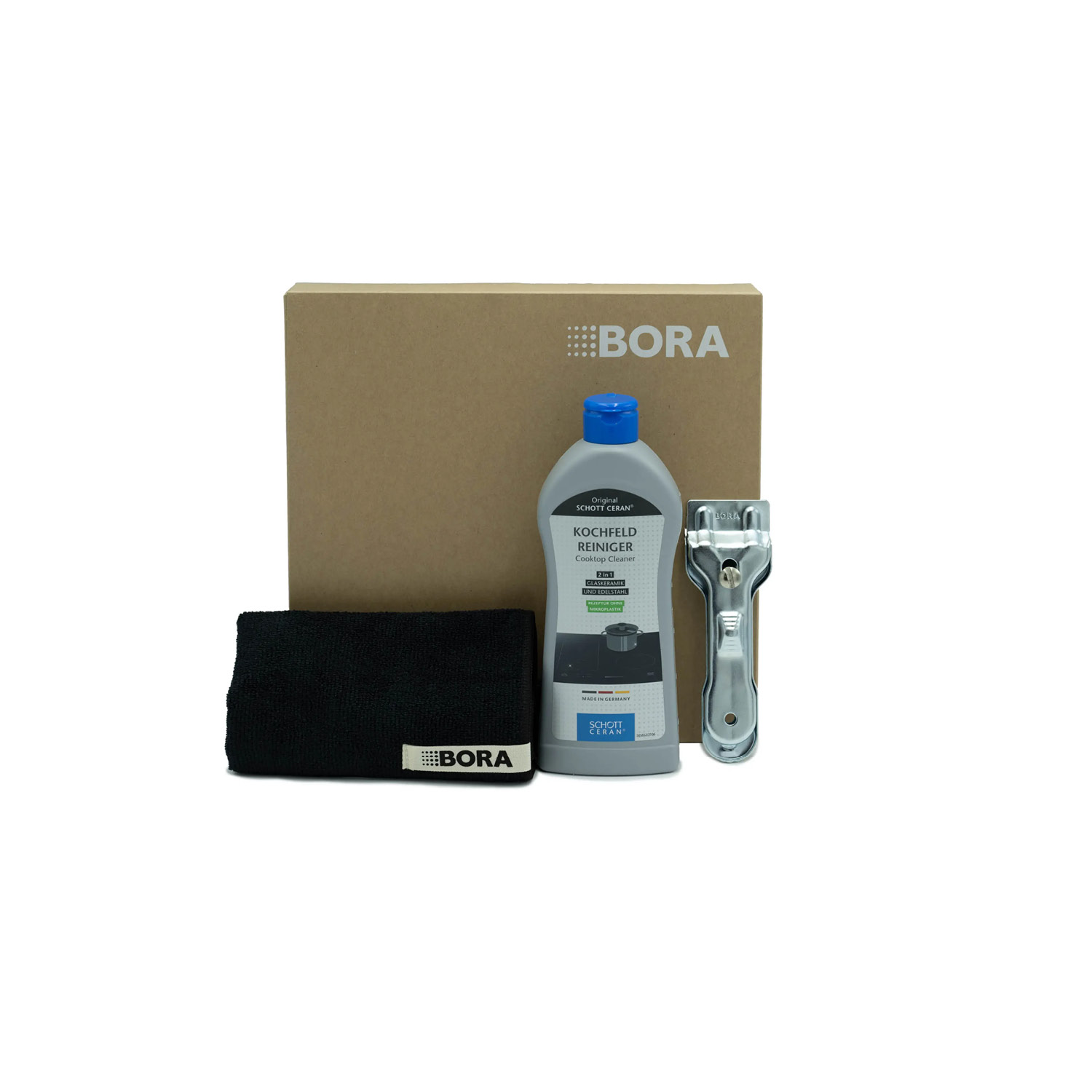 Dzięki zestawowi do czyszczenia BORA płyta po gotowaniu będzie znów wyglądać jak nowa. Zestaw zawiera środek do czyszczenia płyt kuchennych, ściereczkę z mikrofibry BORA w eleganckiej czerni oraz skrobaczkę szklano-ceramiczną ze stali nierdzewnej, która delikatnie usuwa uporczywe zabrudzenia z płyty kuchennej.