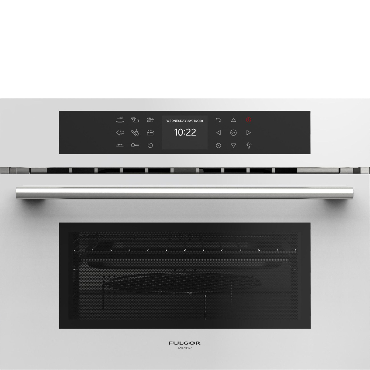 Piekarnik z funkcją mirofali Fulgor Milano FCMO 4510 TEM WH z serii Plano, w kolorze białe szkło, komora ze stali nierdzewnej, 10 funkcji, o szerokości 60 cm i wysokości 45 cm, 34 l.