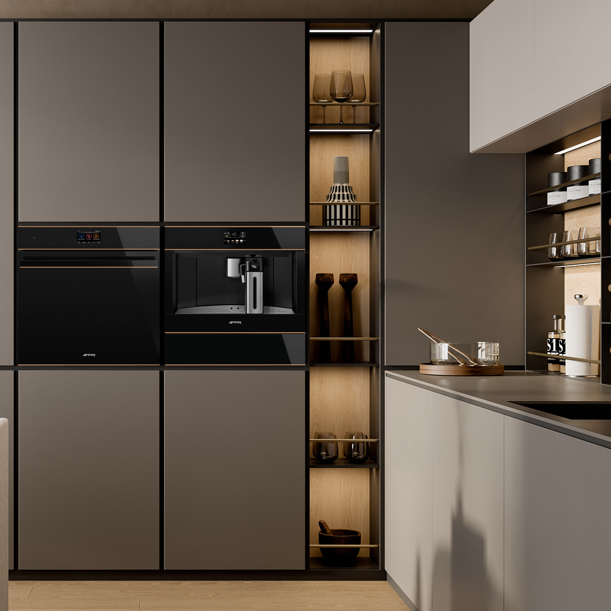 Ekspres do kawy Smeg do zintegrowanej zabudowy z serii Dolce Stil Novo z miedzianym wykończeniem komponentów i 5-letnią gwarancją producenta.