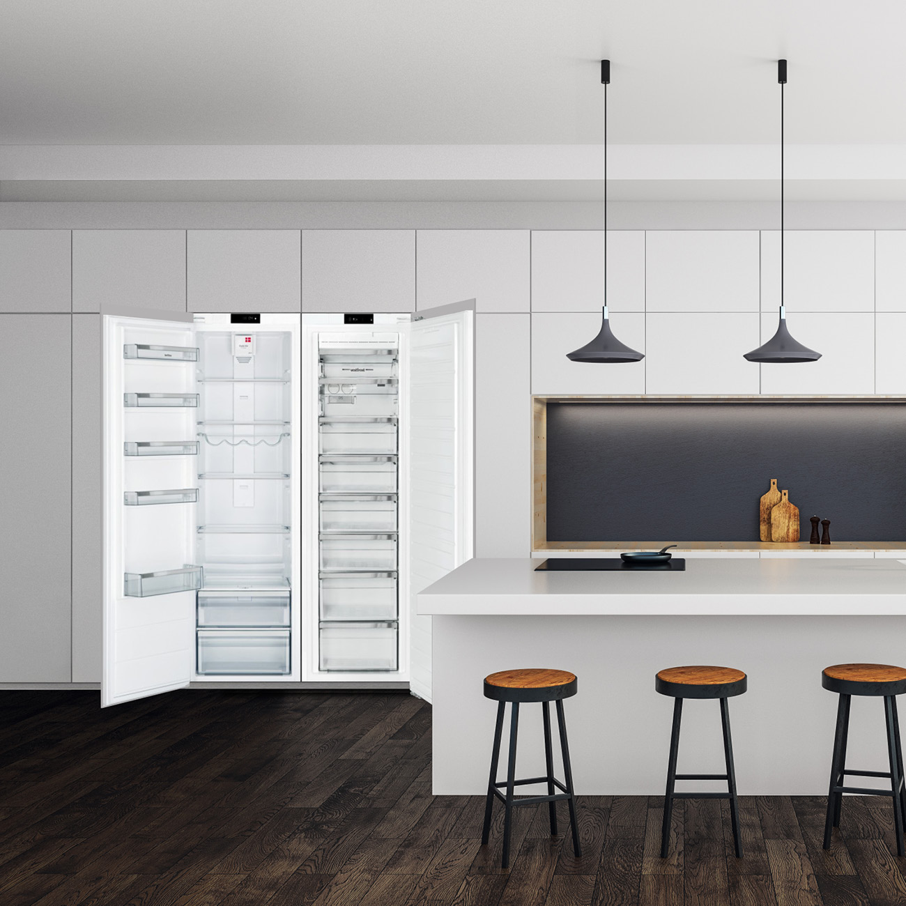 Zamrażarka szufladowa do zabudowy w kolorze białym Vestfrost, NoFrost, kostkarka Twisted Icematic, oświetlenie LED, sterowanie Touch Control, h=177 cm.