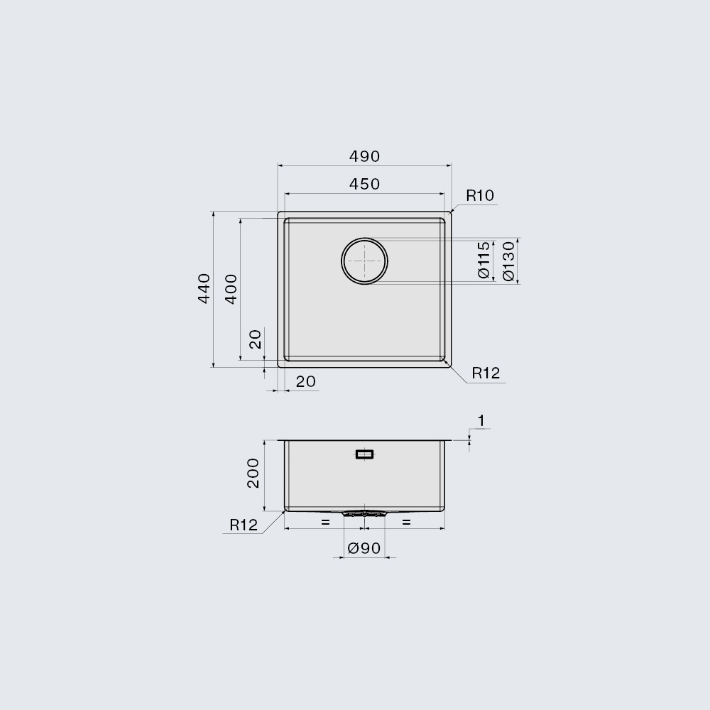Zlewozmywak 1-komorowy w kolorze stalowym do zabudowy podblatowej, z otworem przelewowym, bezszwowy system odwadniający Falmec, włókno dźwiękochłonne, 49 cm.