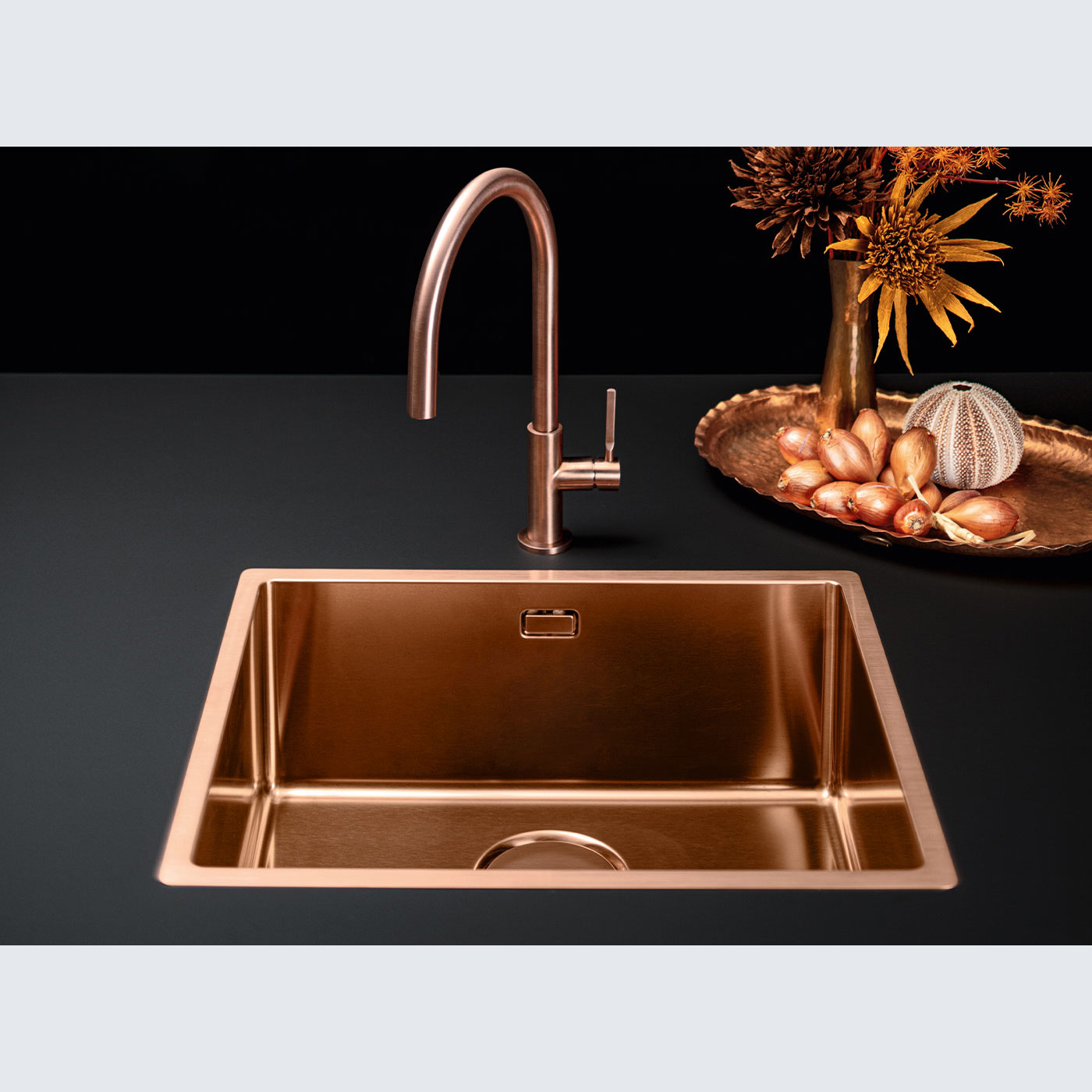 Zlewozmywak 1-komorowy w kolorze miedzianym do zabudowy nablatowej/na równi z blatem/podblatowej, z otworem przelewowym, bezszwowy system odwadniający Falmec, 54 cm.