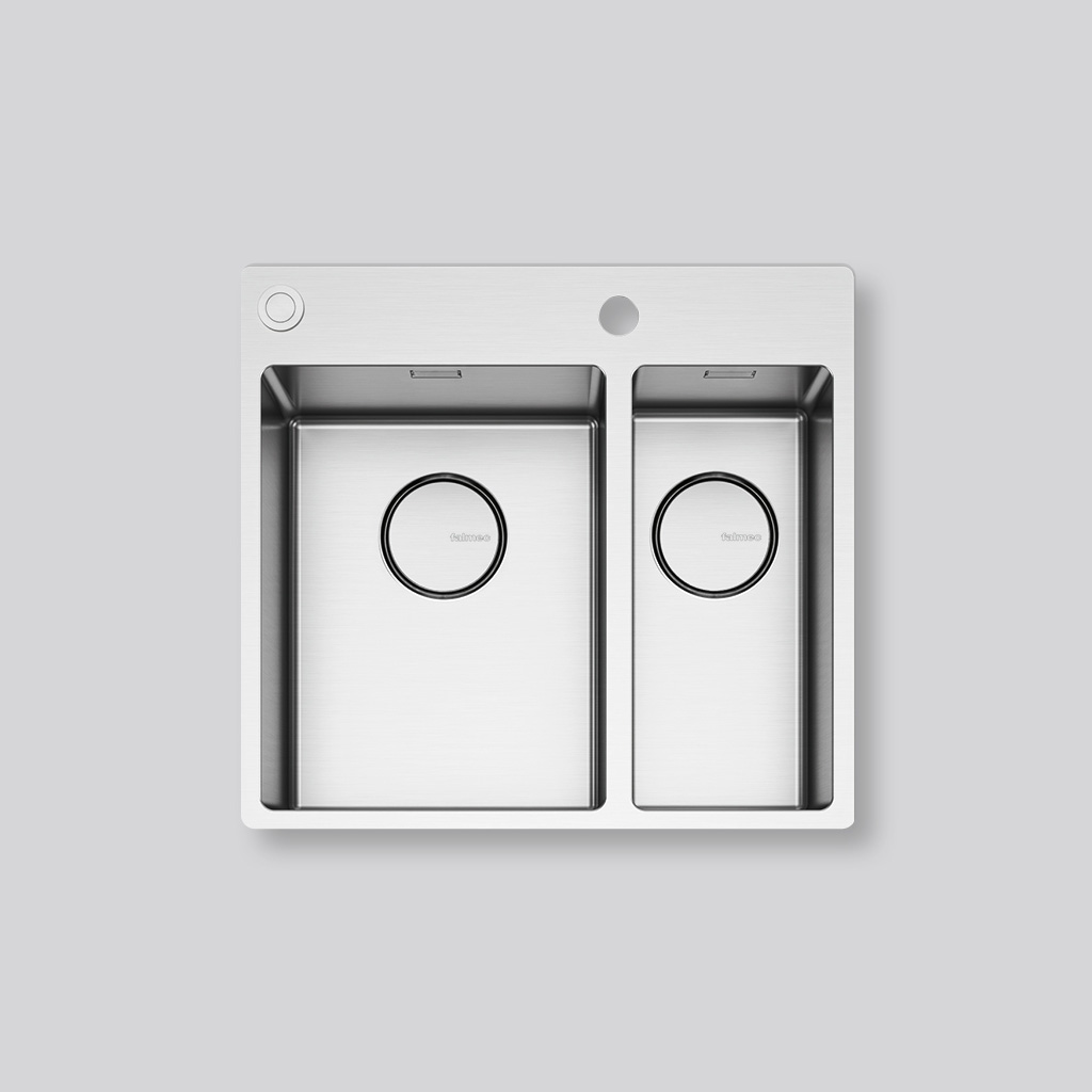 Zlewozmywak 2-komorowy w kolorze stalowym do zabudowy nablatowej/na równi z blatem, z otworem przelewowym, bezszwowy system odwadniający Falmec, włókno dźwiękochłonne, 56 cm.