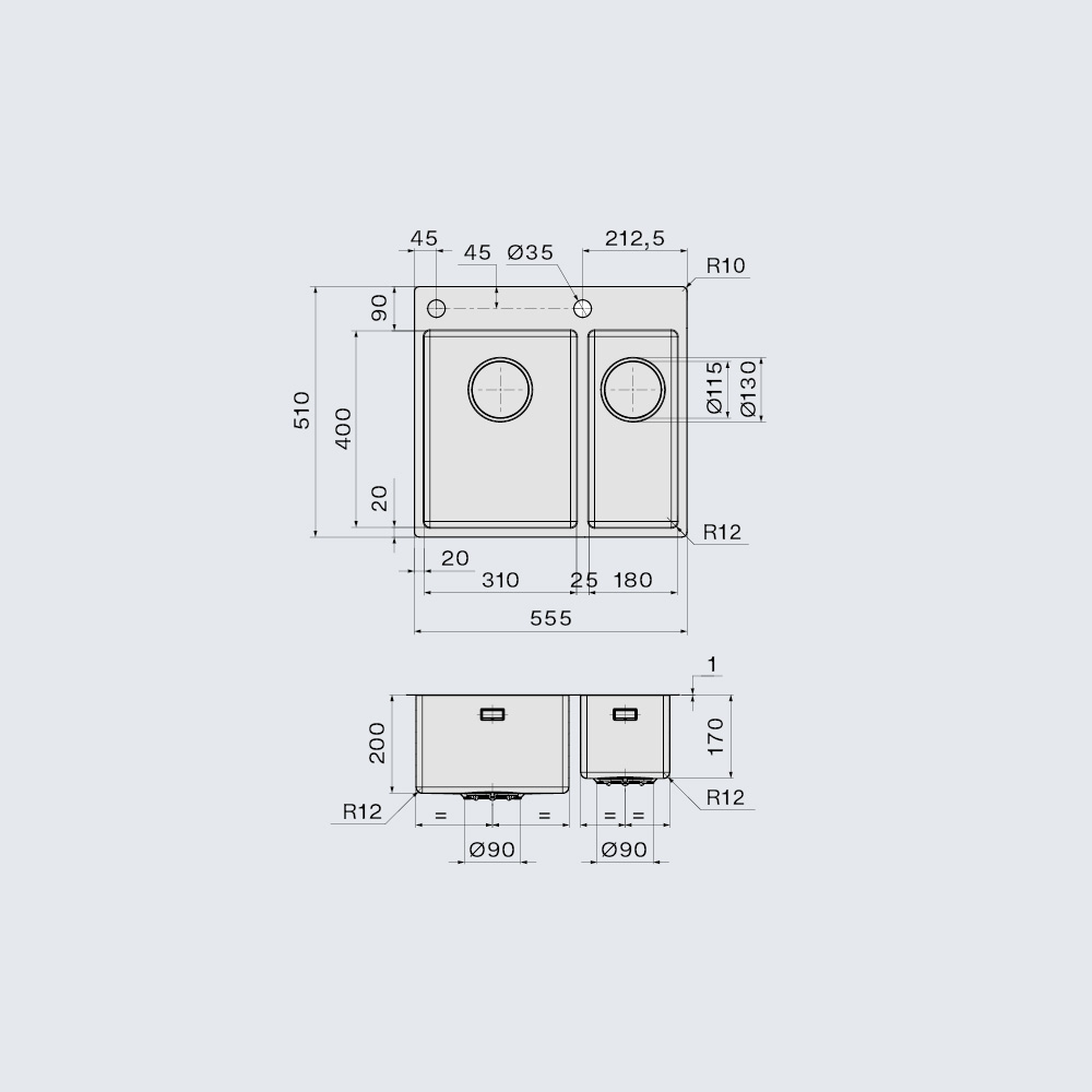 - Głębokość komory prawej 170 mm