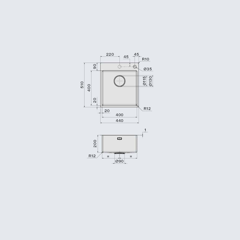 Zlewozmywak 1-komorowy w kolorze stalowym do zabudowy nablatowej/na równi z blatem, z otworem przelewowym, bezszwowy system odwadniający Falmec, włókno dźwiękochłonne, 44 cm.