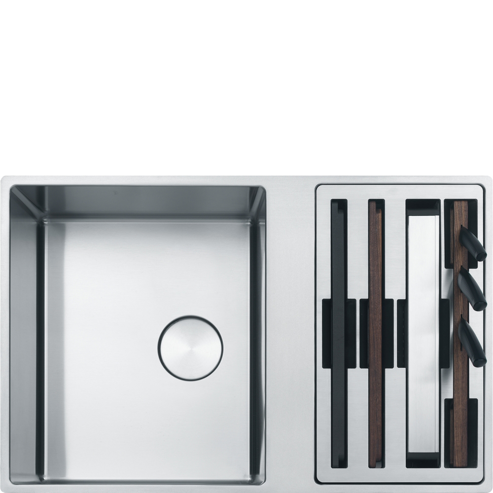 Zlewozmywak 2-komorowy w kolorze stalowym do zabudowy na równi z blatem / nablatowej slimtop w zestawie z wkładką ociekową, drewnianą i syntetyczną deska do krojenia, zestawem noży, suszarką do naczyń oraz korkiem automatycznym sterowanym przyciskiem Easy Click w wykończeniu stali szlachetnej, 15 lat gwarancji, 79 cm.