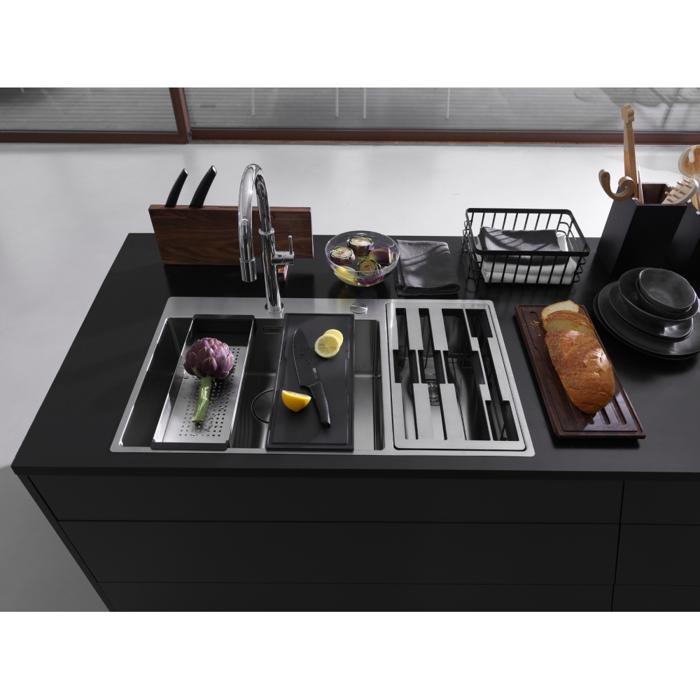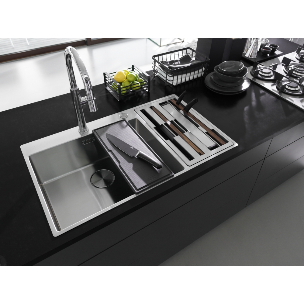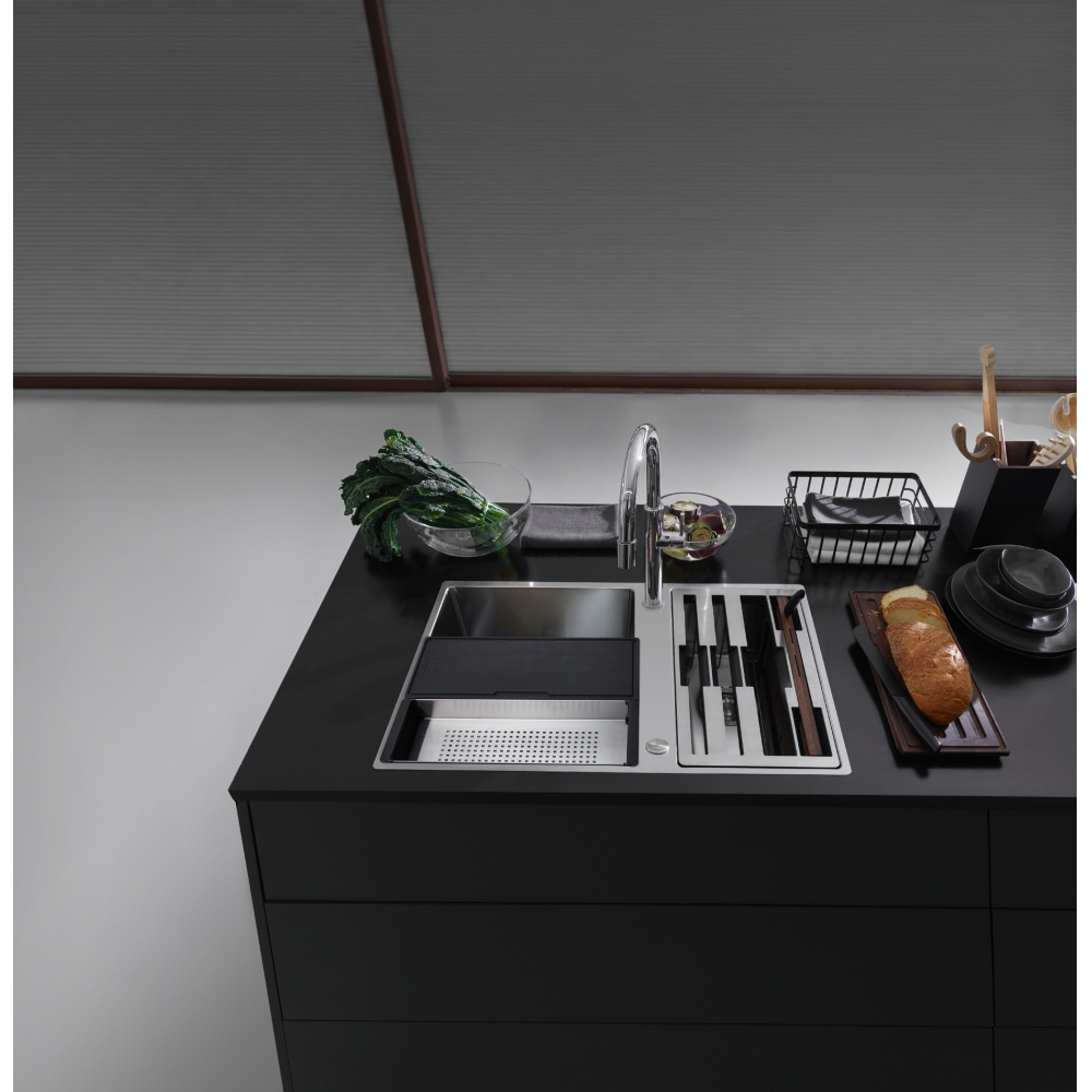 Zlewozmywak 2-komorowy w kolorze stalowym do zabudowy na równi z blatem / nablatowym slimtop w zestawie z wkładką ociekową, drewnianą i syntetyczną deska do krojenia, zestawem noży, suszarką do naczyń oraz korkiem automatycznym sterowanym przyciskiem Easy Click w wykończeniu stali szlachetnej, komora z akcesoriami po prawej stronie, 15 lat gwarancji, 86 cm.