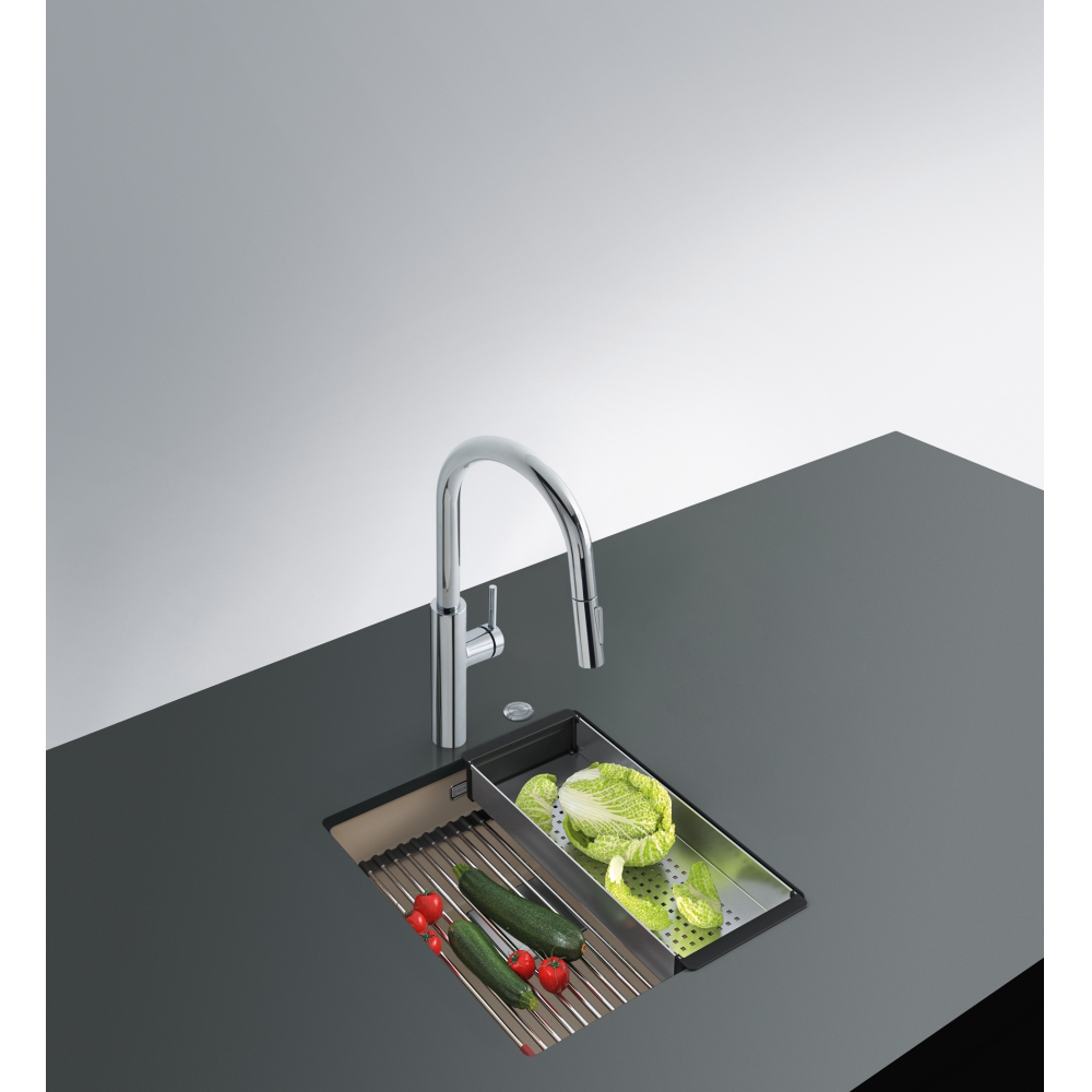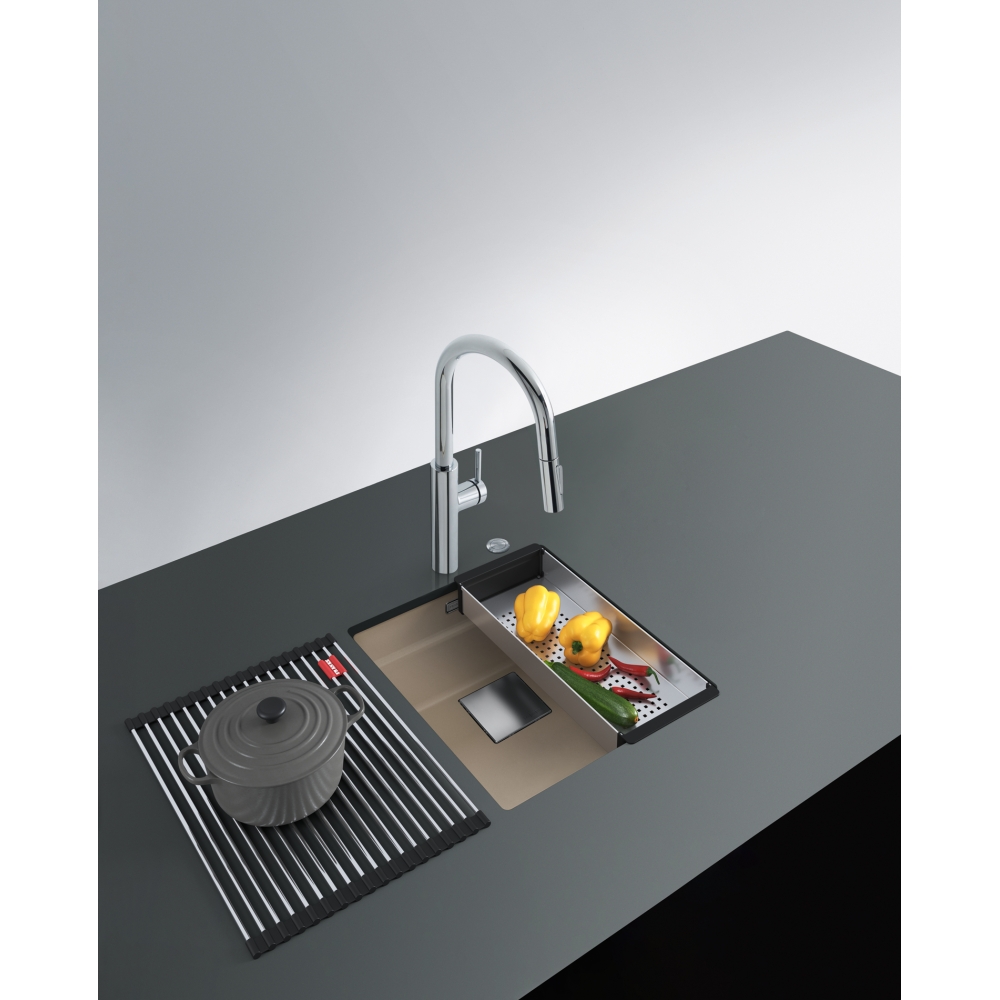 Dzięki specjalnie zaprojektowanej krawędzi wewnętrznej, można komfortowo korzystać z akcesoriów na dwóch poziomach pracy. Zlewozmywak wyprodukowany jest z Fragranitu +, który jest materiałem wyprodukowanym w 80% z naturalnego granitu.Dzięki zastosowaniu bardzo drobnych cząsteczek granitu, uzyskano zlewozmywak idealnie gładki i delikatny w dotyku. Wszystkie zlewozmywaki fragranitowe FRANKE, wyprodukowane są z wykorzystaniem technologii Sanitized®. Zawierają zatem szkło fosforanowe z dodatkiem srebra, ograniczającym rozwój bakterii do 99%. Wszystkie zlewozmywaki z Fragranitu+ są odporne na zarysowania, uderzenia i zaplamienie, a ich kolor nie zmienia się z upływem czasu. Są również odporne na krótkotrwałe działanie wysokiej temperatury (do 280°C przez 15 sek.).