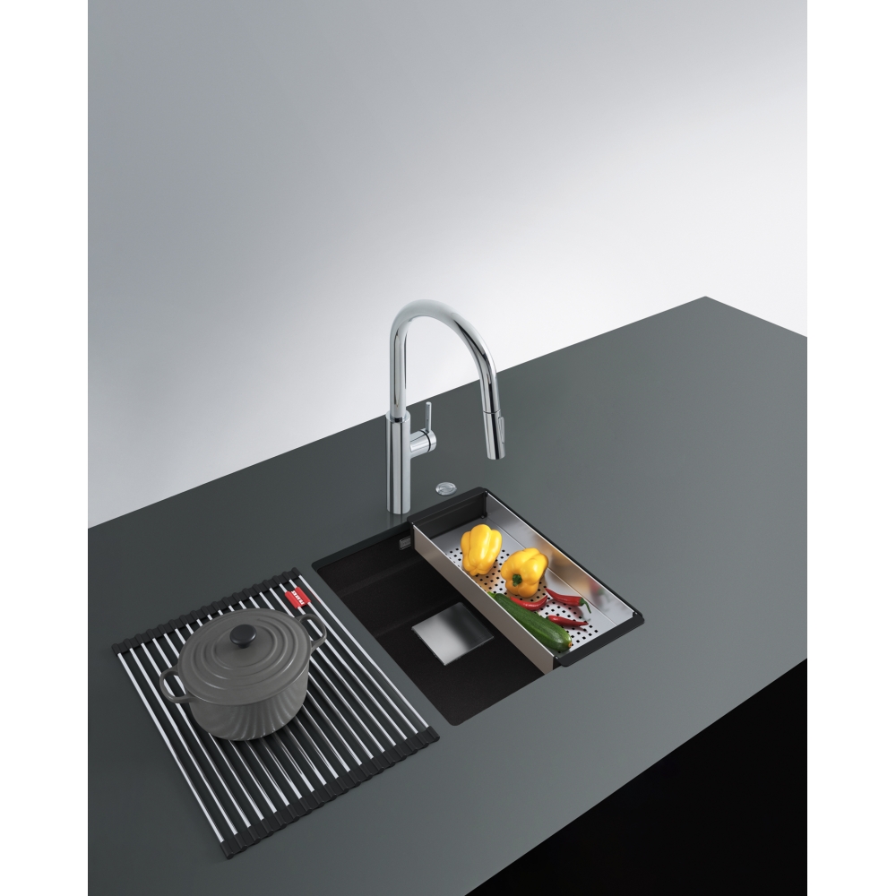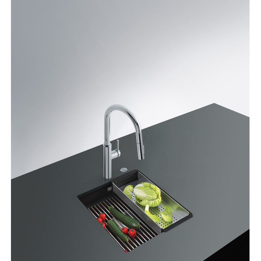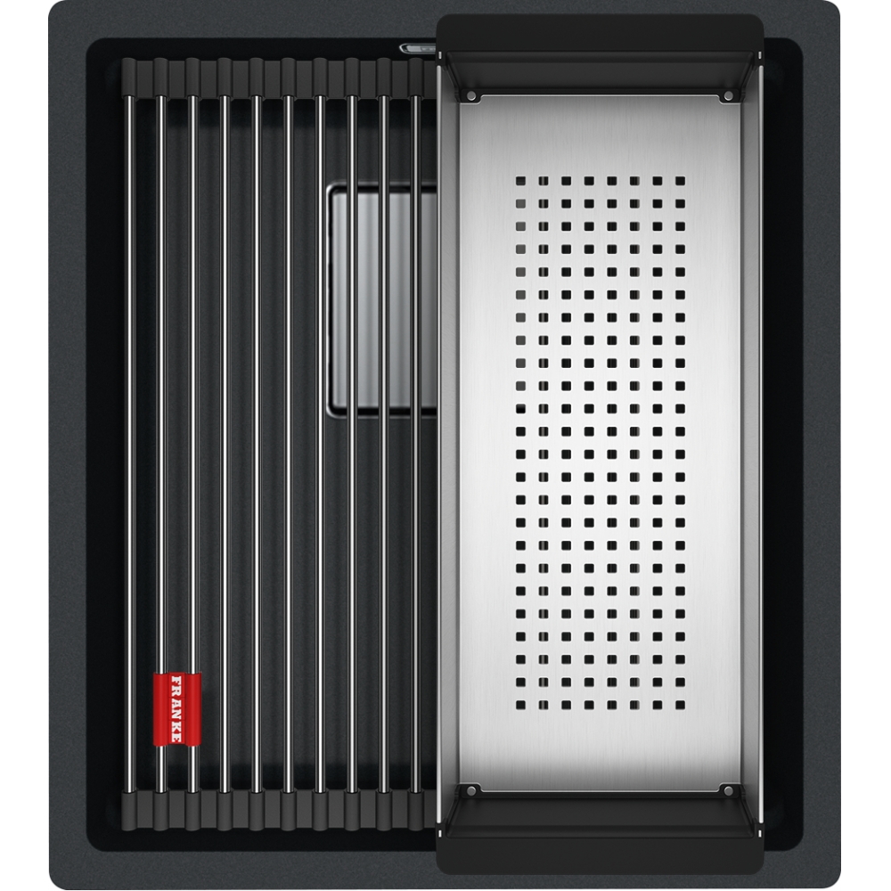 Dzięki specjalnie zaprojektowanej krawędzi wewnętrznej, można komfortowo korzystać z akcesoriów na dwóch poziomach pracy. Zlewozmywak wyprodukowany jest z Fragranitu +, który jest materiałem wyprodukowanym w 80% z naturalnego granitu.Dzięki zastosowaniu bardzo drobnych cząsteczek granitu, uzyskano zlewozmywak idealnie gładki i delikatny w dotyku. Wszystkie zlewozmywaki fragranitowe FRANKE, wyprodukowane są z wykorzystaniem technologii Sanitized®. Zawierają zatem szkło fosforanowe z dodatkiem srebra, ograniczającym rozwój bakterii do 99%. Wszystkie zlewozmywaki z Fragranitu+ są odporne na zarysowania, uderzenia i zaplamienie, a ich kolor nie zmienia się z upływem czasu. Są również odporne na krótkotrwałe działanie wysokiej temperatury (do 280°C przez 15 sek.).