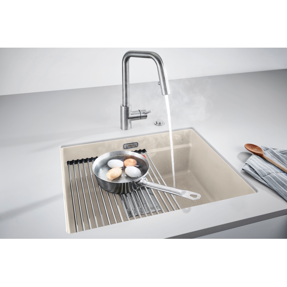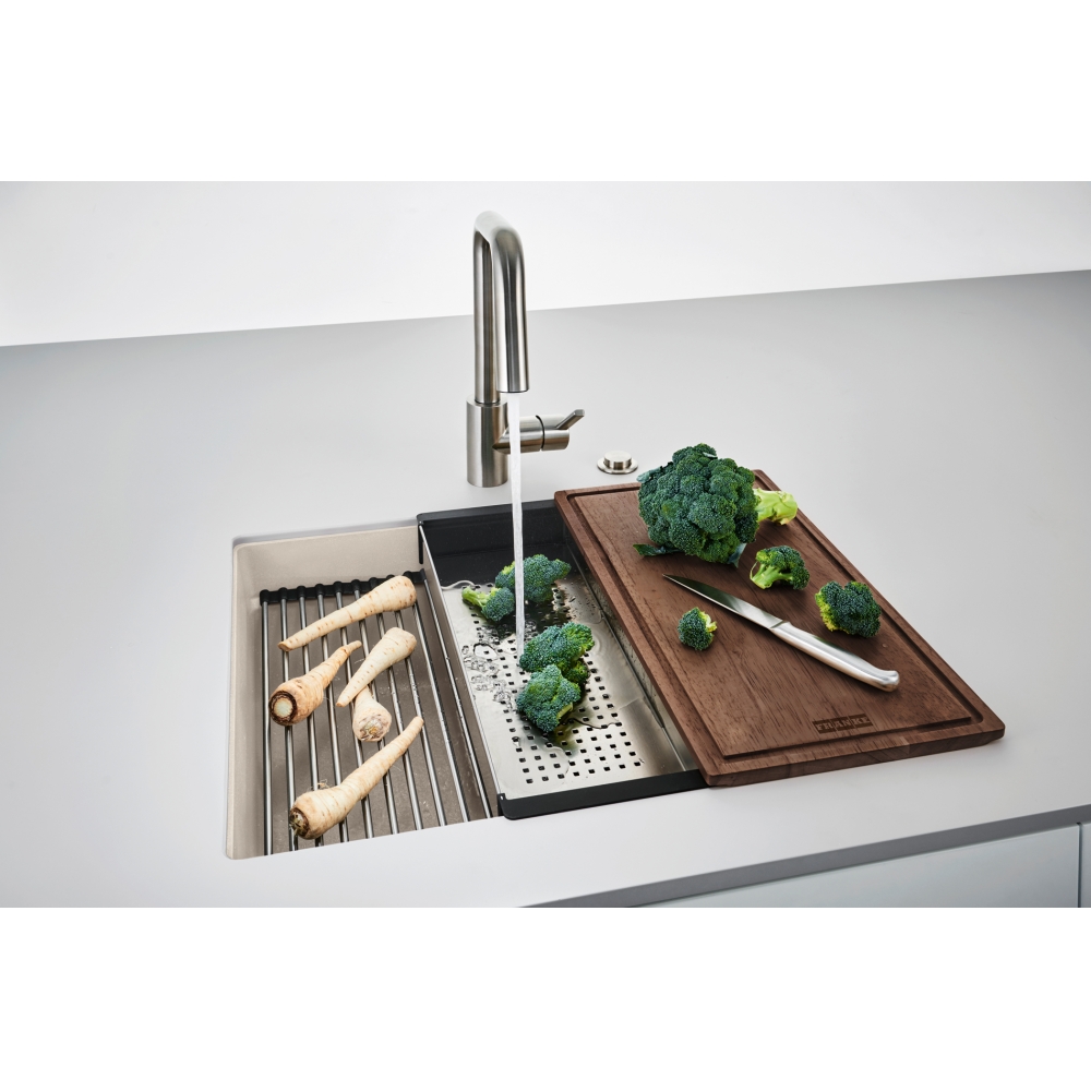 Dzięki specjalnie zaprojektowanej krawędzi wewnętrznej, można komfortowo korzystać z akcesoriów na dwóch poziomach pracy. Zlewozmywak wyprodukowany jest z Fragranitu +, który jest materiałem wyprodukowanym w 80% z naturalnego granitu.Dzięki zastosowaniu bardzo drobnych cząsteczek granitu, uzyskano zlewozmywak idealnie gładki i delikatny w dotyku. Wszystkie zlewozmywaki fragranitowe FRANKE, wyprodukowane są z wykorzystaniem technologii Sanitized®. Zawierają zatem szkło fosforanowe z dodatkiem srebra, ograniczającym rozwój bakterii do 99%. Wszystkie zlewozmywaki z Fragranitu+ są odporne na zarysowania, uderzenia i zaplamienie, a ich kolor nie zmienia się z upływem czasu. Są również odporne na krótkotrwałe działanie wysokiej temperatury (do 280°C przez 15 sek.).