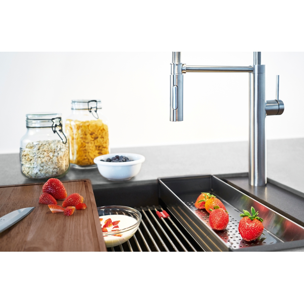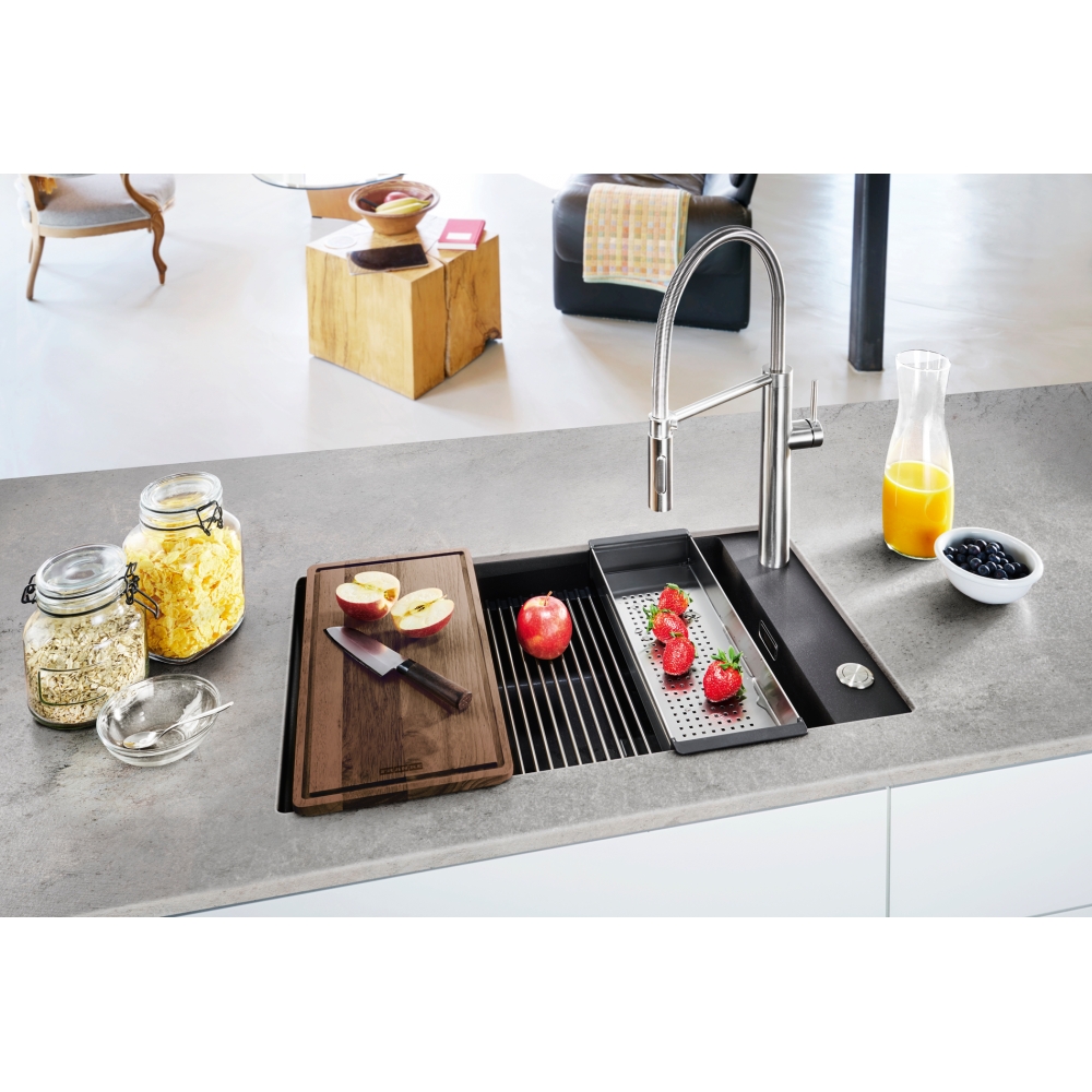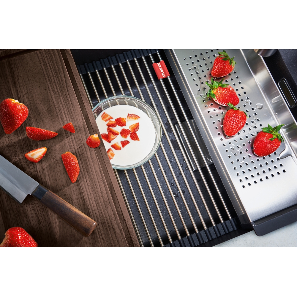 Dzięki specjalnie zaprojektowanej krawędzi wewnętrznej, można komfortowo korzystać z akcesoriów na dwóch poziomach pracy. Zlewozmywak wyprodukowany jest z materiału Fragranite, którego bazą jest naturalny granit.Dzięki zastosowaniu bardzo drobnych cząsteczek tego materiału, uzyskano zlewozmywak idealnie gładki i delikatny w dotyku. Wszystkie zlewozmywaki fragranitowe FRANKE, wyprodukowane są z wykorzystaniem technologii Sanitized®, ograniczającej rozwój bakterii do 99%. Wszystkie zlewozmywaki z Fragranite są odporne na zarysowania, uderzenia i zaplamienie, a ich kolor nie zmienia się z upływem czasu. Są również odporne na krótkotrwałe działanie wysokiej temperatury (do 280°C przez 15 sek.).