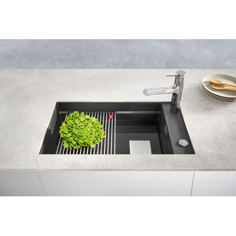 Zlewozmywak jednokomorowy w kolorze onyx do zabudowy podblatowej w zestawie z wkładką ociekową, rollmatą oraz korkiem automatycznym Flow Pro sterowanym przyciskiem Easy Click w wykończeniu ze stali szlachetnej, 15 lat gwarancji, 76 cm.