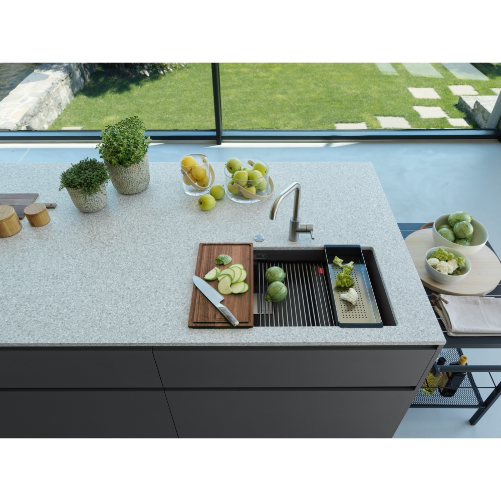 Zlewozmywak 1,5-komorowy w kolorze onyx do zabudowy podblatowej w zestawie z wkładką ociekową, rollmatą oraz korkiem automatycznym Flow Pro sterowanym przyciskiem Easy Click w wykończeniu ze stali szlachetnej, 15 lat gwarancji, 76 cm.