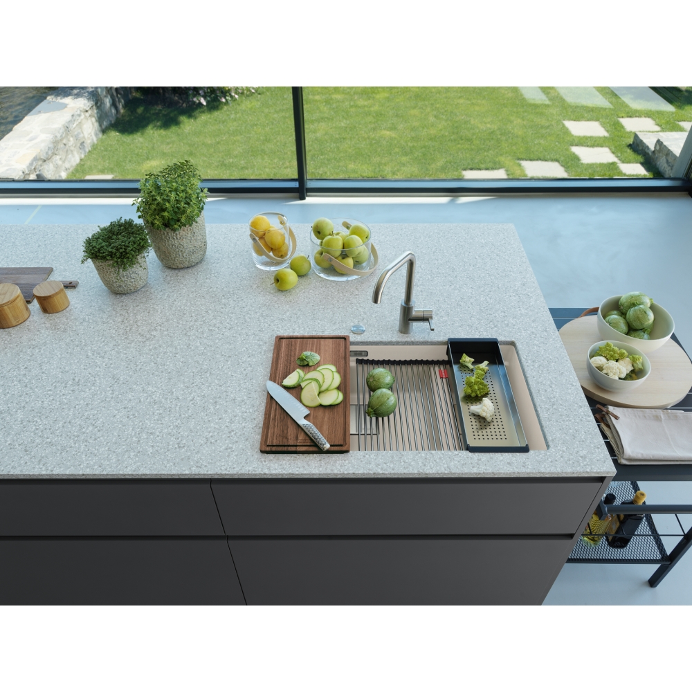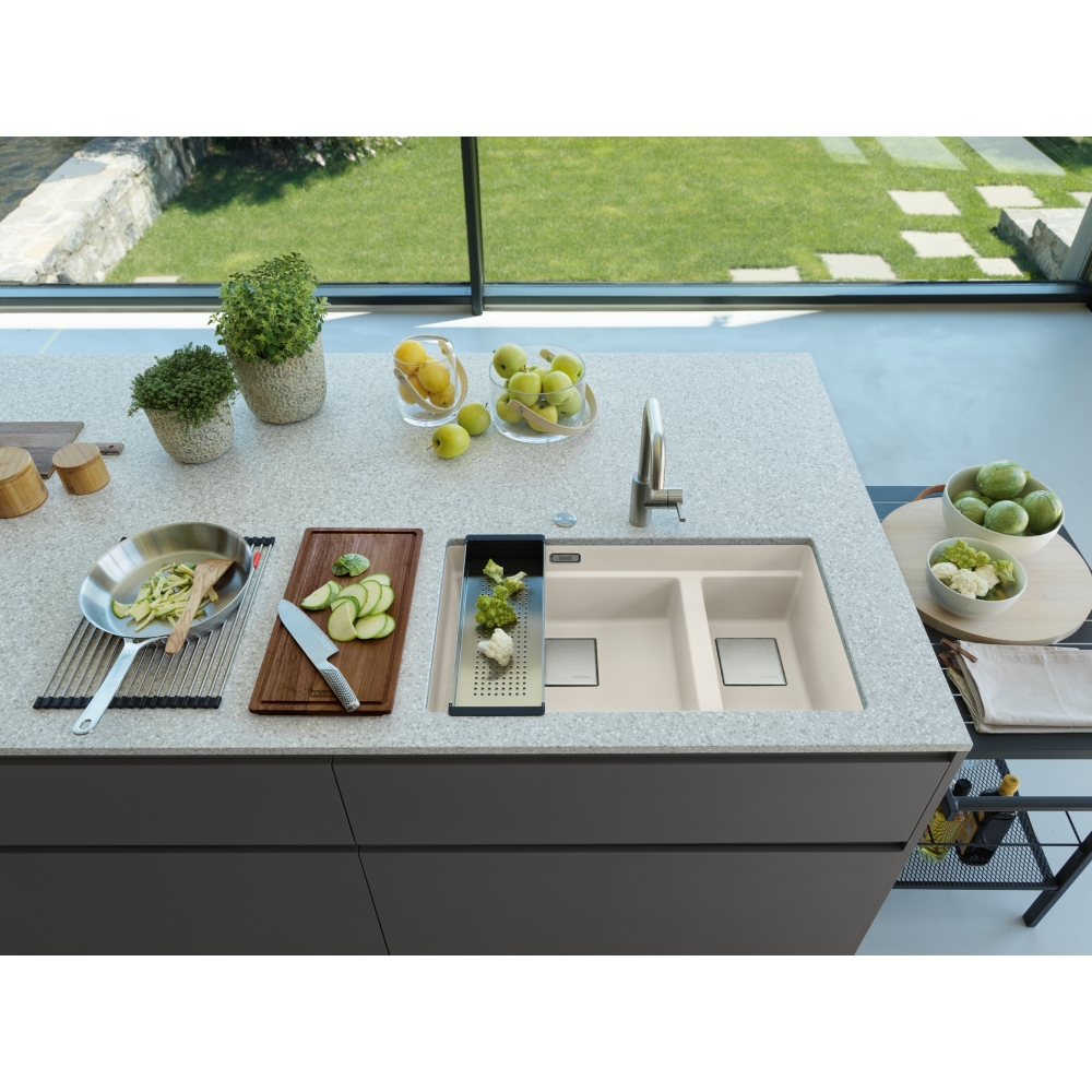 Dzięki specjalnie zaprojektowanej krawędzi wewnętrznej, można komfortowo korzystać z akcesoriów na dwóch poziomach pracy. Zlewozmywak wyprodukowany jest z materiału Fragranite, który składa się w 80% z naturalnego granitu. Dzięki zastosowaniu bardzo drobnych cząsteczek granitu, uzyskano zlewozmywak idealnie gładki i delikatny w dotyku. Wszystkie zlewozmywaki fragranitowe Franke wyprodukowane są z wykorzystaniem technologii Sanitized®, w związku z czym zawierają szkło fosforanowe z dodatkiem srebra, ograniczającym rozwój bakterii do 99%. Wszystkie zlewozmywaki z materiału Fragranite są odporne na zarysowania, uderzenia i zaplamienie, a ich kolor nie zmienia się z upływem czasu. Są również odporne na krótkotrwałe działanie wysokiej temperatury (do 280°C przez 15 sek.).