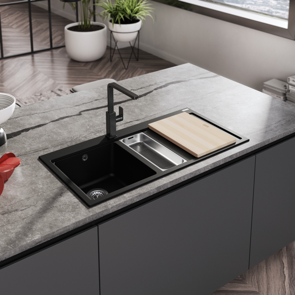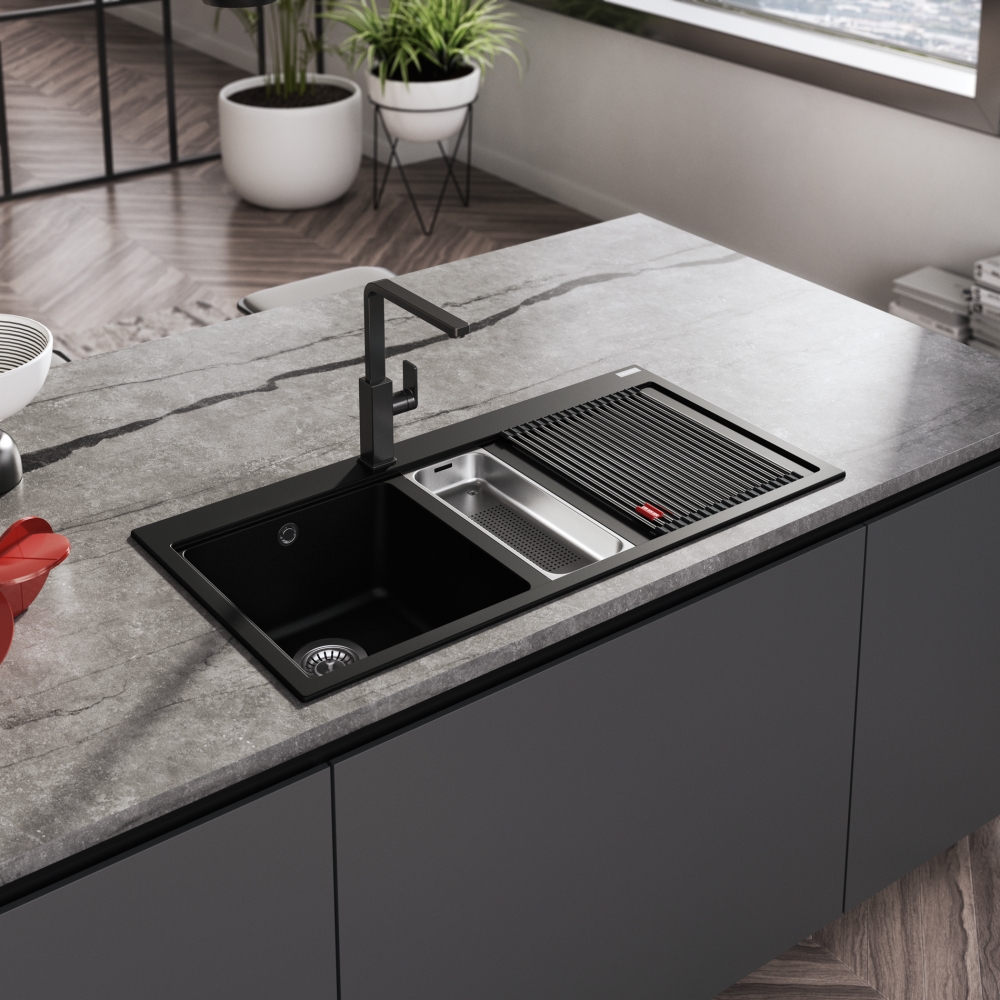 Zlewozmywak 1,5-komorowy z ociekaczem po prawej stronie w kolorze onyx do zabudowy nablatowej w zestawie z wkładką ociekową, rollmatą oraz korkiem zatyczkowym Grey Line  3 1/2″, 15 lat gwarancji, 100 cm.