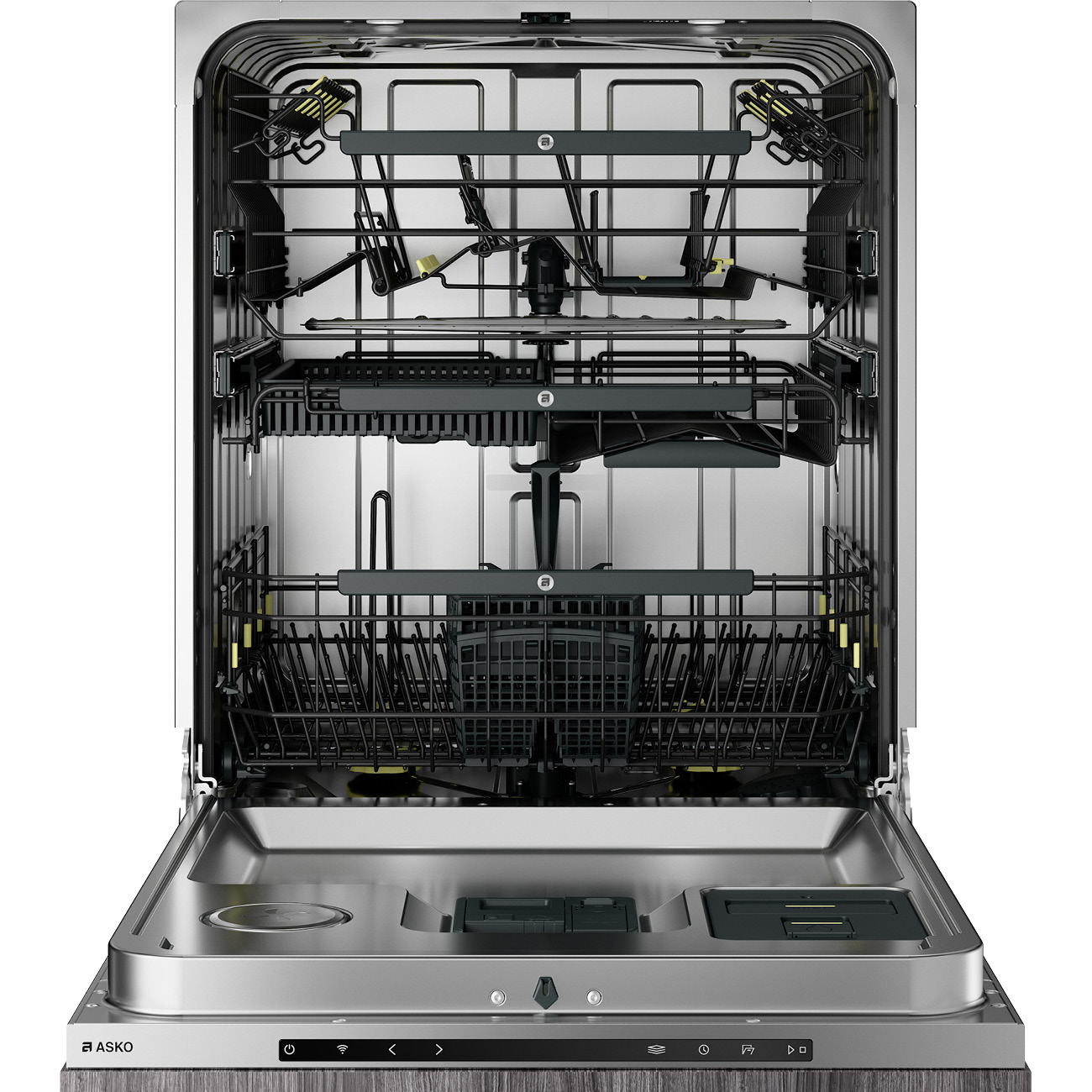 Trzypoziomowy system koszy ASKO pozwala na optymalizację obciążenia. Zdejmuj, reguluj, składaj i przesuwaj stojaki, rzędy grzebieni i kosz na sztućce, zgodnie z bieżącymi potrzebami.