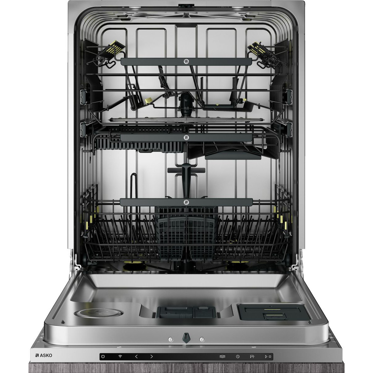 Trzypoziomowy system koszy ASKO pozwala na optymalizację obciążenia. Zdejmuj, reguluj, składaj i przesuwaj stojaki, rzędy grzebieni i kosz na sztućce, zgodnie z bieżącymi potrzebami.