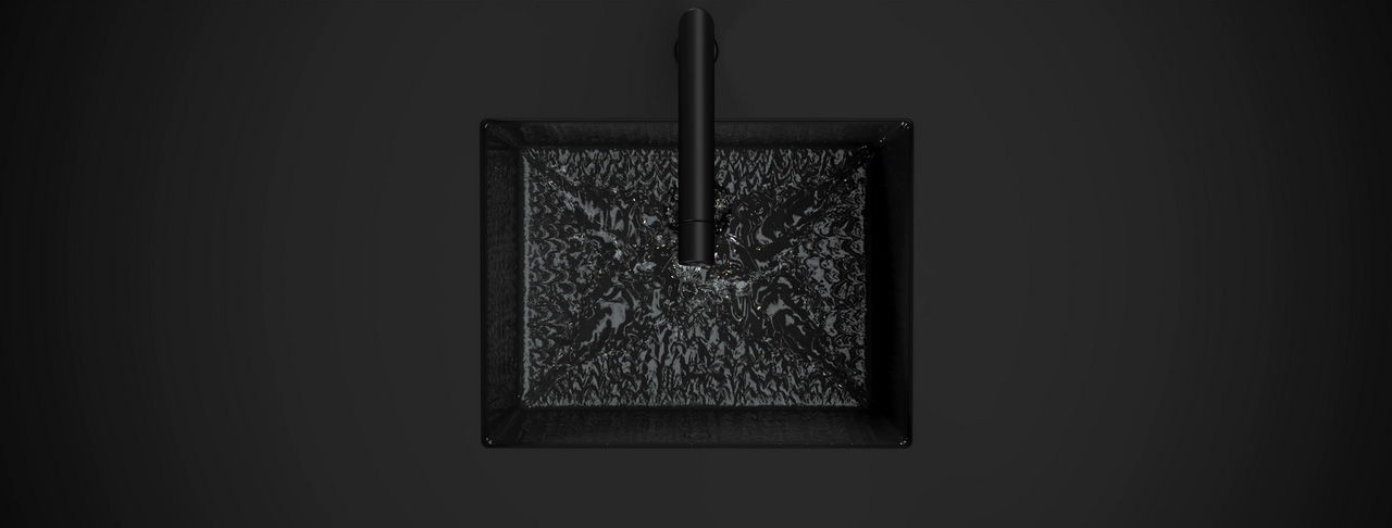 Zlewozmywak i armaturę o kolorze głębokiej czerni defi niują precyzyjne krawędzie. Zamiast dodatkowych elementów obsługowych zastosowano w nich całościową, zredukowaną do minimum koncepcję obsługi. Otwór przelewowy zlewozmywaka znajduje się na niewidocznym boku, dzięki czemu nic nie zakłóca głębokiej czerni powierzchni.