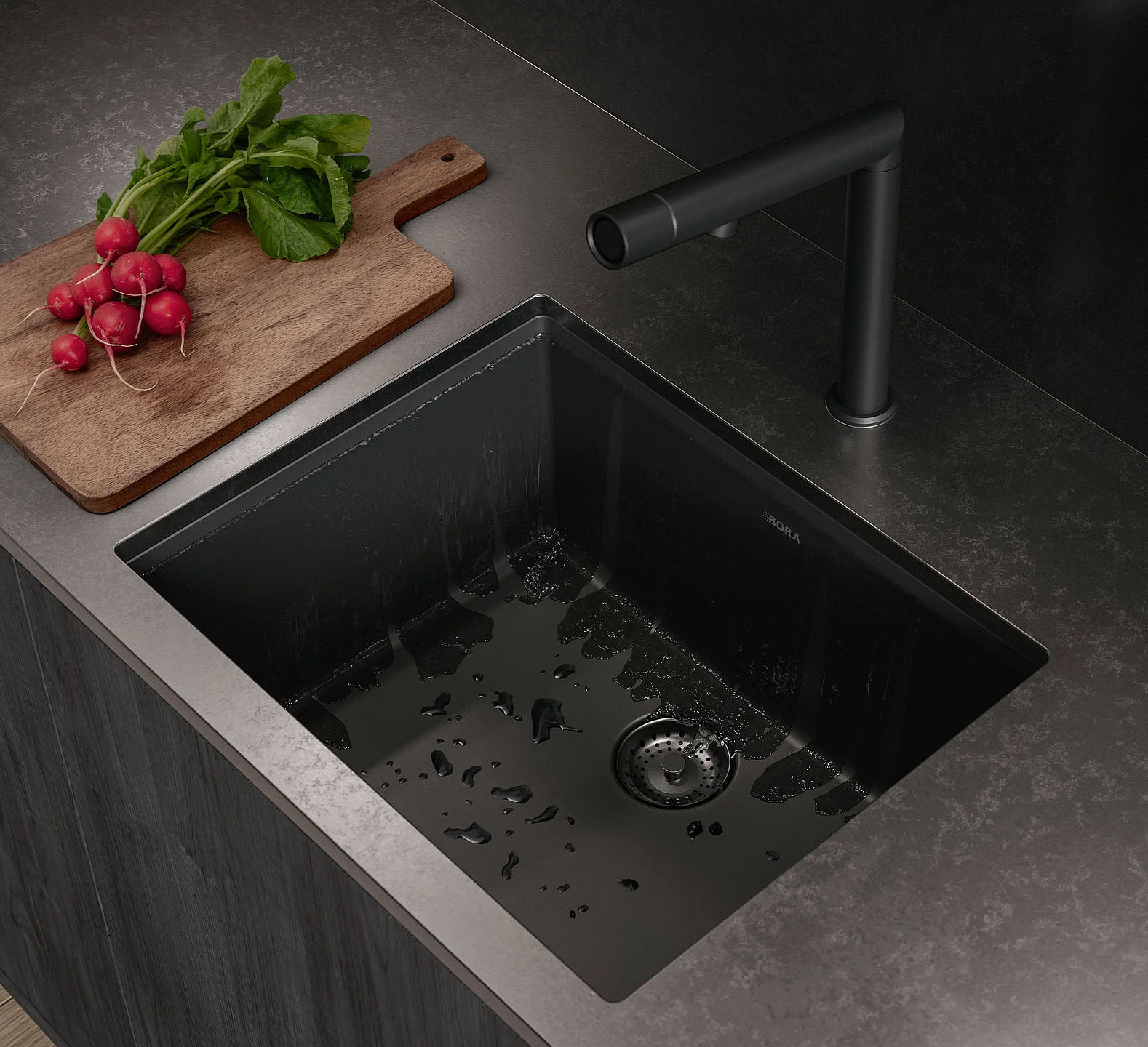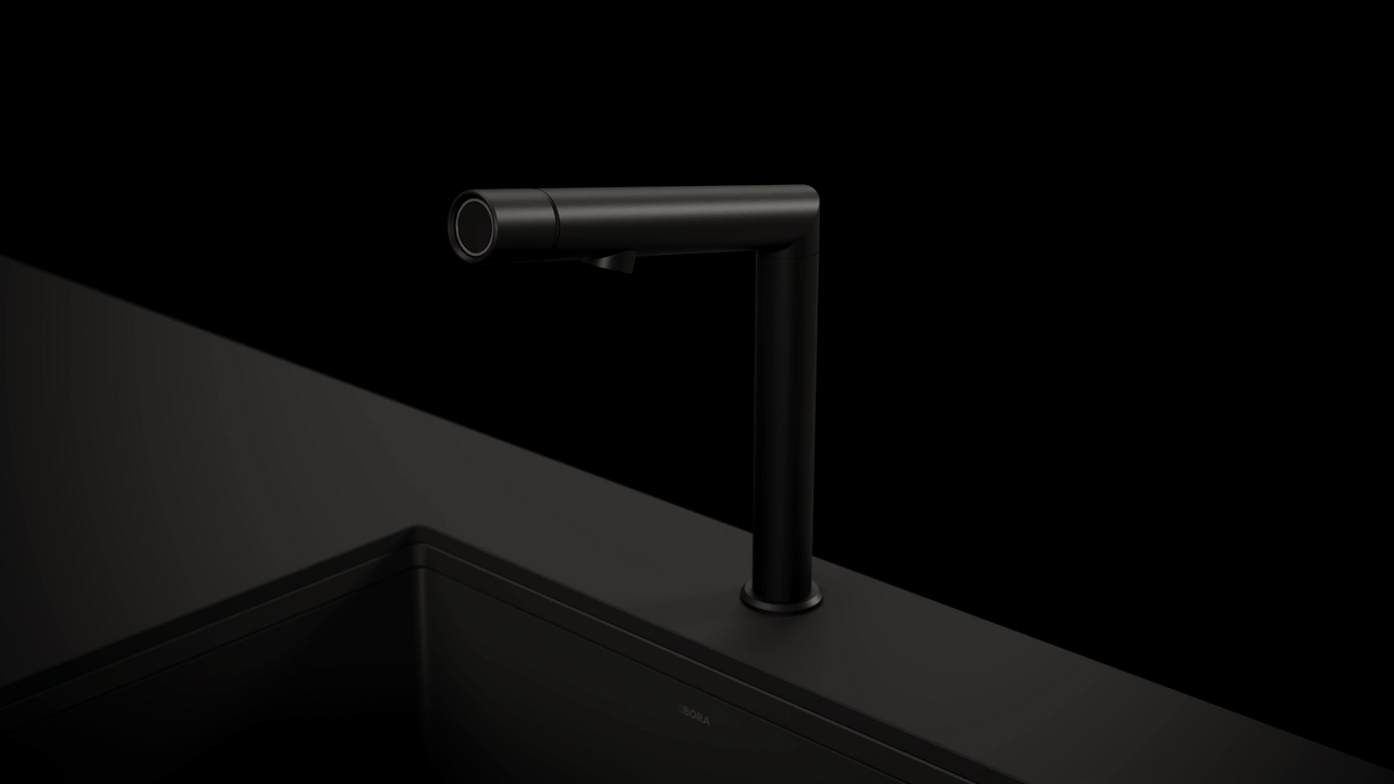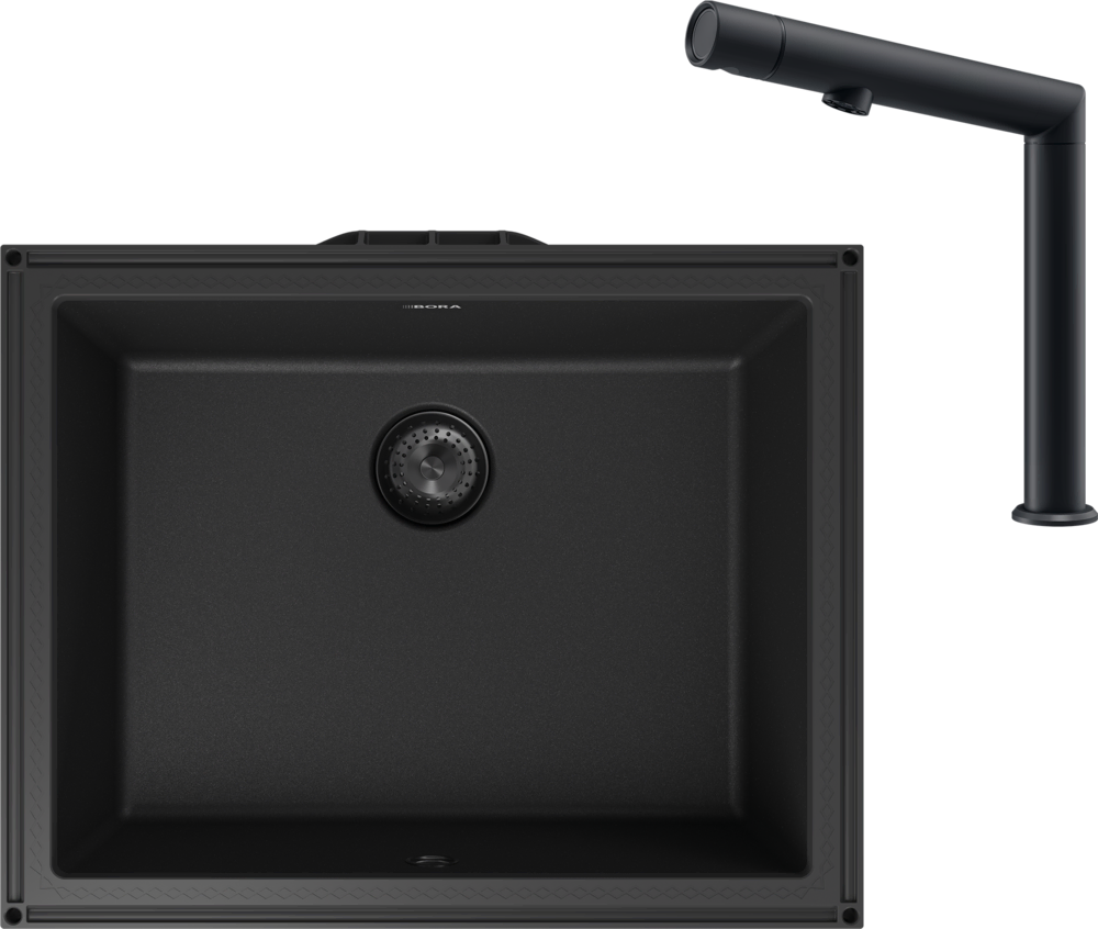 Automatyczna czystość. Wystarczy jedno naciśnięcie przycisku, aby zlewozmywak BORA Sink wyczyścił się sam. Zanieczyszczenia i brud są usuwane wodą ze wszystkich powierzchni i spłukiwane bez pozostałości do odpływu. Głęboko czarny zlew z armaturą płynnie wpasowuje się w filozofię designu marki BORA.